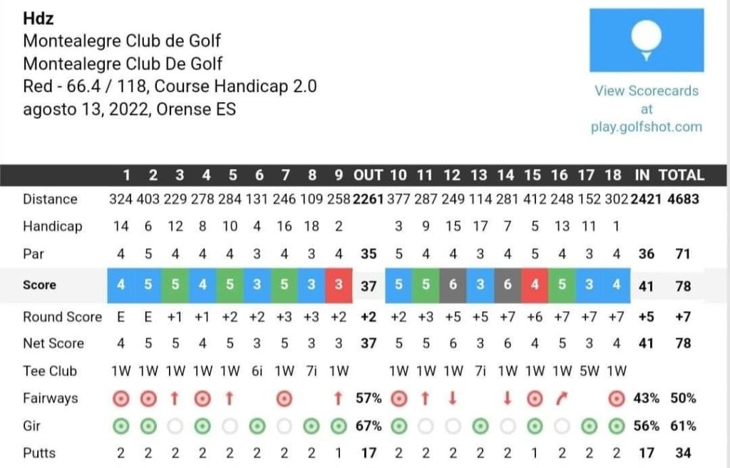 Desde rojas, el campo mide alrededor de 4.700 metros, lo que lo convierte en una opción más accesible para muchos jugadores, pero no te engañes 😜 sigue siendo un reto en términos de precisión. Además, el clima gallego siempre añade un extra de dificultad, por lo que, como bien sabes, es imprescindible llevar un buen paraguas, ya que el tiempo puede cambiar rápidamente y las lluvias suelen sorprender 🤣☔️ (Yo tuve muchísima suerte.. 🌞)